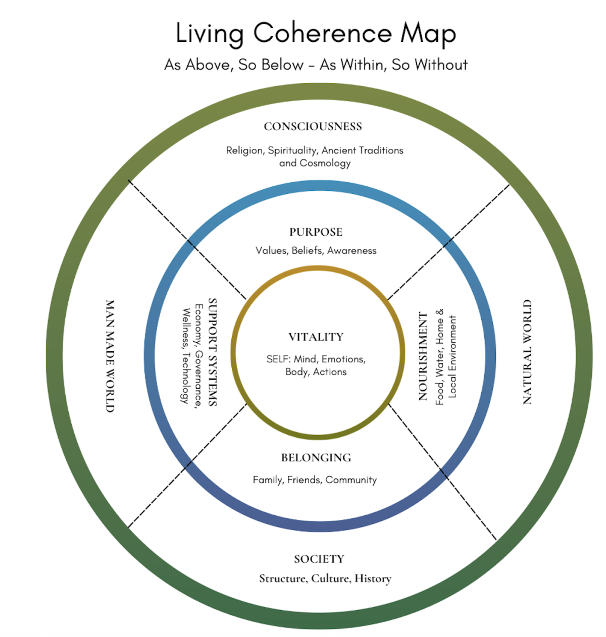 The outer ring reminds us that individual coherence does not exist in isolation. Society, man-made systems, nature, and consciousness are all part of the field we are living within. In the emerging world, systems are redesigned to serve life rather than dominate it. Culture becomes an expression of shared values rather than inherited conditioning. Nature is recognized as a partner, not a backdrop. Consciousness shaped by religion, spirituality, ancient traditions, and cosmology, returns as an orienting force, reconnecting human life with larger patterns of meaning and belonging.