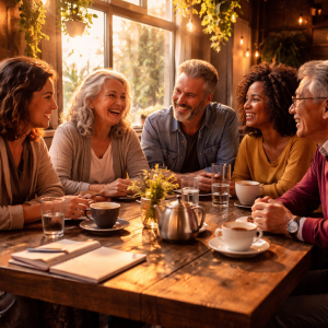 Friendly conversation in warm café light